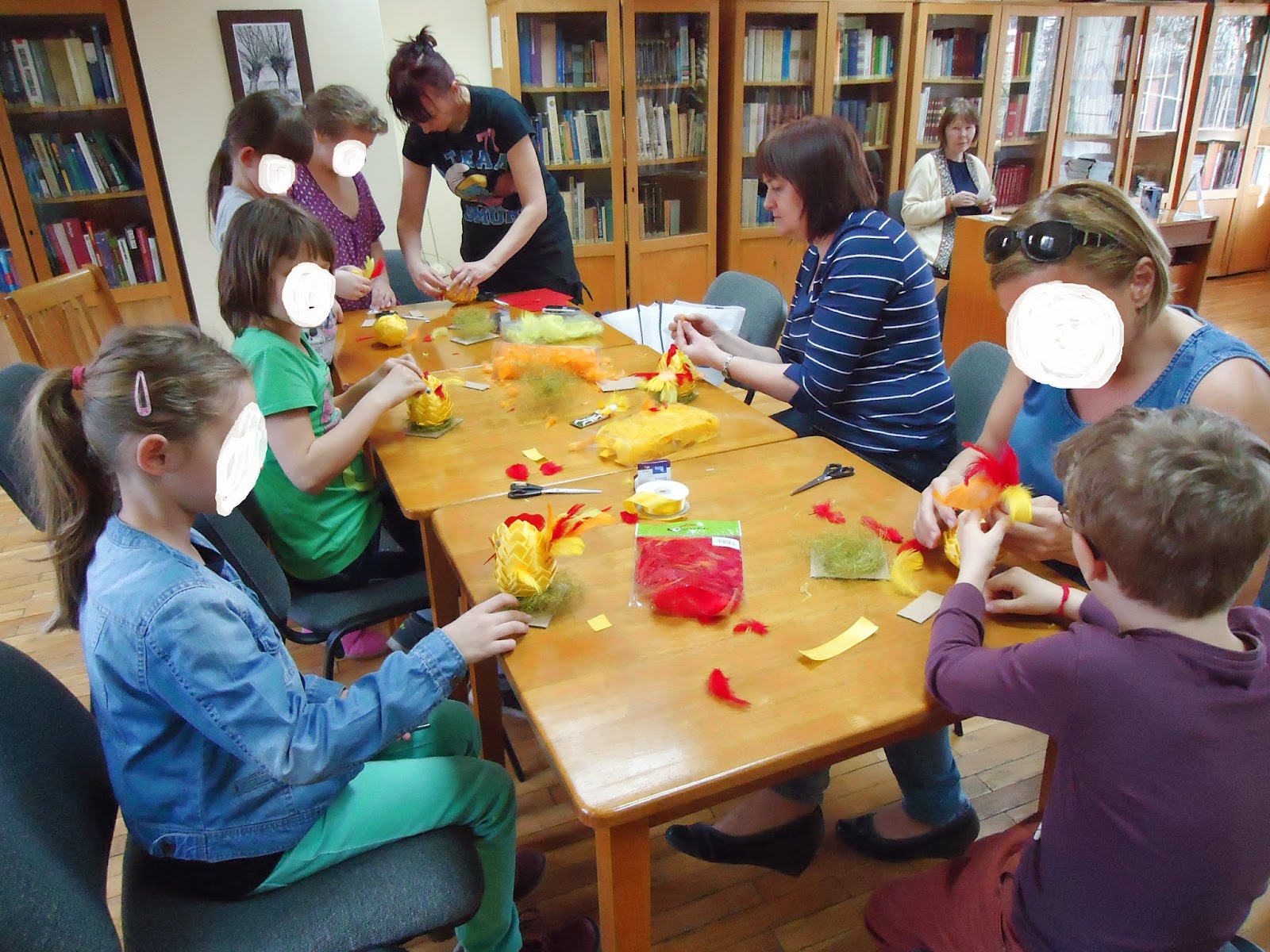 Wielkimi krokami zbliżają się Święta Wielkanocne. Z tej okazji w bibliotece odbyły się warsztaty dla dzieci, podczas których wykonywały karczochowego kurczaka pod czujnym okiem pani Miłki Zajutrek. Do wykonania kurczaków potrzebne były styropianowe jajka, wstążki, maleńkie szpileczki, piórka oraz materiały niezbędne do wykończenia i rączki chętne do pracy :) Wszyscy świetnie sobie poradzili i powstały piękne kurczaki, które teraz można obejrzeć na wystawie w bibliotece.