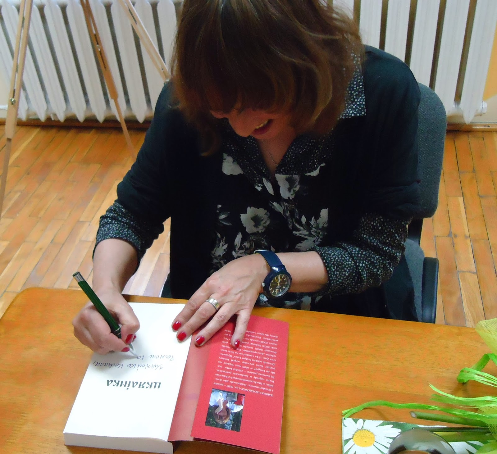 Autorka okazała się niezwykle ciepłą i sympatyczną osobą. Chętnie odpowiadała na pytania i przybliżyła nam tajemnice pisarstwa. Ubawiła wszystkich anegdotą rodzinną związaną z powstaniem książki Niebieski autobus. Rozwiała również domysły moderatorki spotkania, co do motywów napisania powieści Ukrainka.
