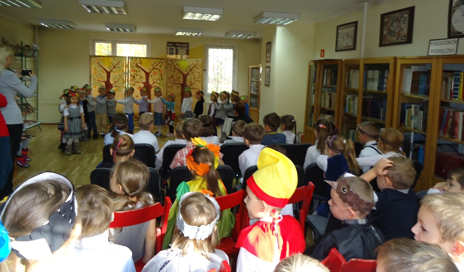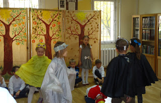 29 października Żabki, Pasikoniki i Motyle z Przedszkola Miejskiego nr 231 wraz ze swoimi nauczycielkami zjawiły się w bibliotece, by uroczyście powitać jesień. Każda z grup przygotowała wspaniały występ artystyczny, podczas którego recytowano wiersze polskich poetów (m. in. Jesień H. Bechlerowej, Jeż H. Zdzitowieckiej) i śpiewano znane i lubiane piosenki o tematyce jesiennej (m. in. Jesienny pociąg D. Gellner). Było pięknie, kolorowo :)