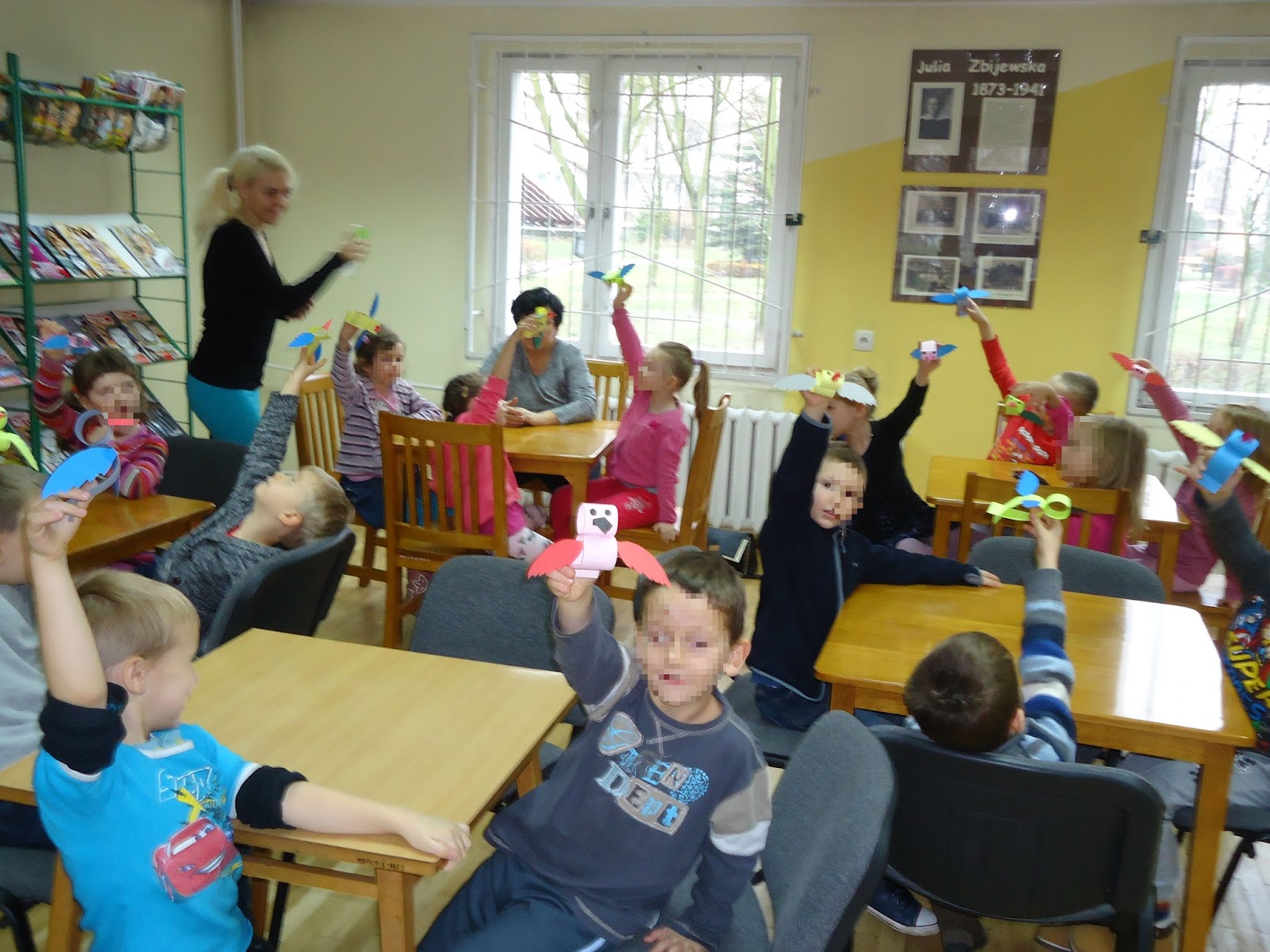 W grudniowy poranek naszą bibliotekę, odwiedziły przedszkolaki z Przedszkola Miejskiego nr 231. Dzieci wzięły udział w warsztatach, w trakcie których dowiedziały się jak dokarmiać ptaki zimą i przygotować dobrą karmę. Poznały również ptaki, które zimują w Polsce oraz takie, które odlatują do ciepłych krajów. Przedszkolaki z grupy X obejrzały różnego rodzaju karmniki. Nie zabrakło śmiechu, przy zabawie ruchowej, jak i zgadywankach. Na zakończenie dzieci same zrobiły z kolorowego papieru bajkowego ptaka. Zajęcia zostały zrealizowane w ramach projektu "Jestem na pTak".
