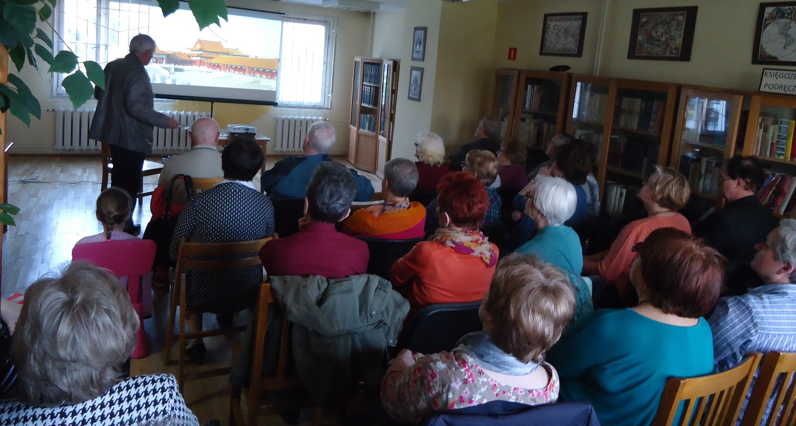 „Pokażę państwu co widziałem, co słyszałem, a potem przedstawię swoje refleksje” - tymi słowami zaczęła się prelekcja multimedialna Witolda Błądka pod tytułem "Od Pekinu do Hongkongu - chińskie refleksje". Swoją opowieść Pan Witold rozpoczął od stolicy Chin - Pekinu, dalej opowiadał o każdej miejscowości, którą zwiedził wraz z małżonką, kończąc na Hongkongu. Prelegent pokazał podczas spotkania zdjęcia pięknych zabytków, jak np. Letni Pałac w Pekinie. Skupił się jednak na przedstawieniu współczesnej architektury zwiedzanych miast, pokazał również stare dzielnice oraz piękne plenery. Pan Witold zwrócił uwagę na życie codzienne chińczyków czy warunki socjalne oraz sposób spędzania wolnego czasu, jak wspólne ćwiczenia, tańce, gry w parkach, na ulicach. Opowiadał również o szybkiej kolei, którą uczestnicy wycieczki przemieszczali się dwa razy. Podkreślił też, że mimo upływu czasu, widać pozostałości po dawnym ustroju. Reasumując spotkanie, prowadzący zauważył, że między innymi społeczeństwo jest mundurowe, a młodzież nie rozstaje się z komórką i komputerem. Temat był obszerny, lecz bardzo ciekawy. Dziękujemy wszystkim za tak liczne przybycie i zapraszamy już w maju ;)