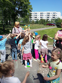12 maja nasza biblioteka zorganizowała imprezę plenerową pt. "Wspólne czytanie na Radogoszczu-Wschodzie". W imprezie udział wzięły 4 grupy z PM nr 231. Dzieci miały za zadanie odnaleźć punkty, na których czekały osoby czytające wiersze znanych i lubianych poetów polskich. Pierwsza stacja znajdowała się w ogrodzie PM nr 231, gdzie Pani Dyrektor przedszkola czytała wiersze Doroty Gellner. Druga stacja mieściła się w parku przy ul. Nastrojowej, tam poezję Jana Brzechwy, czytała "Ciotka Klotka" -Pani Jola z DKK. Pan Prezes ze Spółdzielni Mieszkaniowej Radogoszcz-Wschód czekał na dzieci na trzeciej stacji, która mieściła się na Placu Słonecznym.Ostatnia stacja była oczywiście przed nasz biblioteką. Tutaj wiersze Juliana Tuwima czytała Pani Bogusia oraz Pan Czesław. Na zakończenie dzieci otrzymały pamiątkowe kukiełki oraz ozdobiły kolorową kredą alejkę przed biblioteką. Akcja została zorganizowana z okazji TYGODNIA BIBLIOTEK. Bardzo dziękujemy wszystkim osobom, które brały udział w naszej akcji, za poświęcony czas.