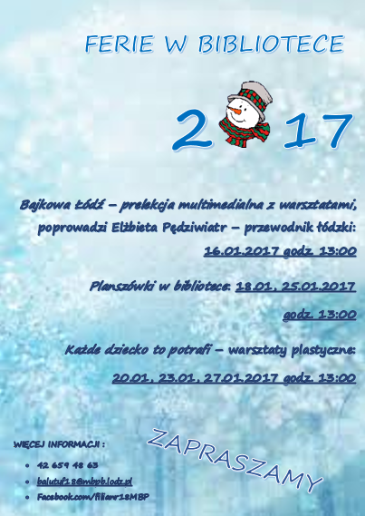 Tegoroczne ferie w naszej bibliotece odbywały się tym razem przez dwa tygodnie stycznia. Rozpoczęliśmy je prelekcją multimedialną pt. "Bajkowa Łódź", którą w bardzo ciekawy sposób przedstawiła Ela Pędziwiatr - znana i lubiana łódzka przewodniczka. W pozostałe dni organizowane były warsztaty plastyczne, które bardzo przypadły do gustu młodym uczestnikom. Dużo emocji i rywalizacji wzbudziły gry planszowe, w które można było zagrać w każdą środę ferii. Wszystkim uczestnikom dziękujemy za mile spędzony czas w bibliotece.