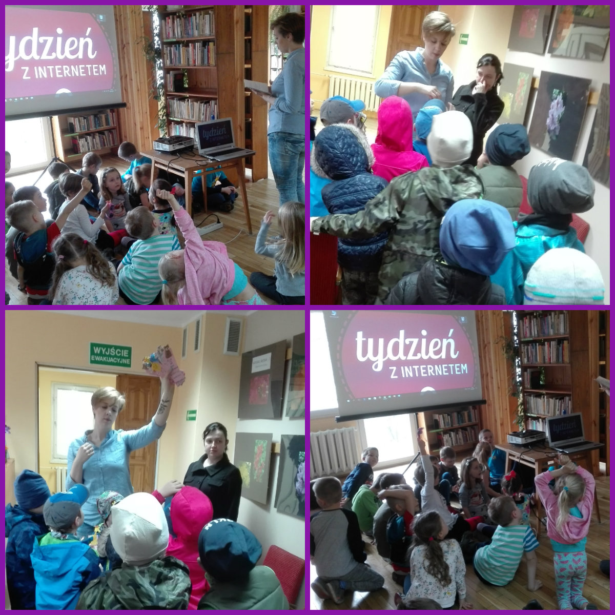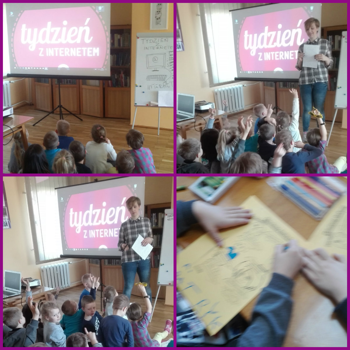 W dniach 27.03-02.04.2017 po raz pierwszy nasza biblioteka wzięła udział w ogólnoeuropejskiej kampanii TYDZIEŃ Z INTERNETEM. Celem tego przedsięwzięcia jest zachęcenie jak największej ilości osób do poznania możliwości jakie daje nam Internet. Tematem tego TYGODNIA było hasło "Inspiruj się i dziel swoimi pasjami", dlatego też pokazałam dzieciom z PM nr 231 różne metody wykorzystania sprzętu komputerowego, tabletów, smartfonów. Dowiedzieliśmy się również jak prawidłowo i bezpiecznie poruszać się w sieci. Nie zabrakło krótkich quizów i upominków :) Każde dziecko dostało własnoręcznie wykonane zakładki, kolorowanki, a także książeczki z instrukcjami jak korzystać z Internetu. Podczas dwóch spotkań przedszkolaki dowiedziały się jak korzystać między innymi z tabletów, a także nauczyły się robić selfie :)