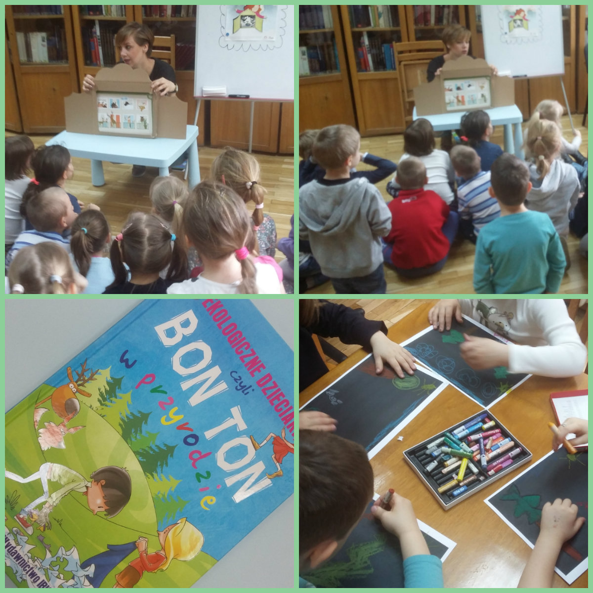 W piątkowe przedpołudnie, naszą bibliotekę odwiedziła grupa VIII z PM nr 231. Tematem naszego spotkania była ochrona przyrody. "Pasikoniki" wysłuchały krótkiej bajki metodą kamishibai, pt. "Dlaczego zwierzaki mieszkają w bloku Maćka?", autorstwa Tomasza Trojanowskiego. Kamishibai ( kami – papier, shibai – sztuka) to tajemnicze słowo znaczy nie co innego, tylko teatr obrazkowy lub inaczej teatr ilustracji. Z bajki Tomasza trojanowskiego dzieci dowiedziały się jak ważne jest dbanie o naszą przyrodę. Powtórzyliśmy też Regulamin ekologa. Na zakończenie zajęć każdy wykonał obraz pięknego, zielonego i zadbanego lasu. Dziękujemy "Pasikonikom" za bardzo fajne zajęcia! :)