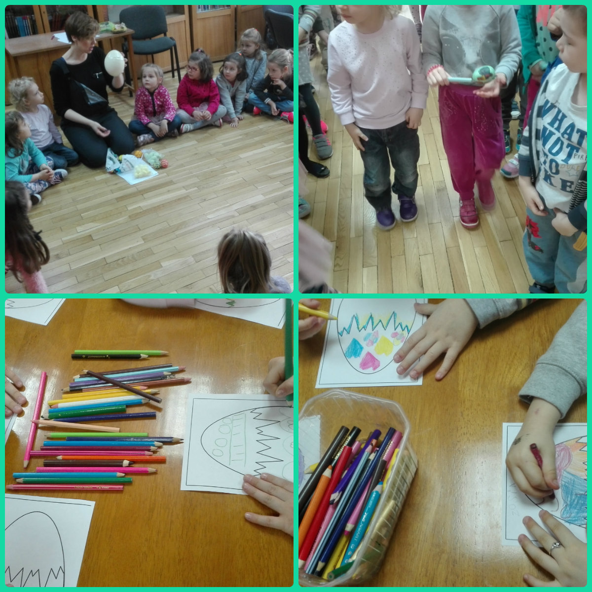 Święta tuż tuż... z tej okazji naszą bibliotekę odwiedziły dwie grupy z PM nr 231: "Niedźwiadki" i "Jeżyki". Podczas zajęć rozmawialiśmy o zwyczajach wielkanocnych, takich jak święcenie koszyczka czy śmigus-dyngus. Obejrzeliśmy wykonane przez naszych czytelników piękne pisanki. Jednak największą atrakcją okazało się strusie jajo :) Nie zabrakło również wyścigów z jajeczkiem :)