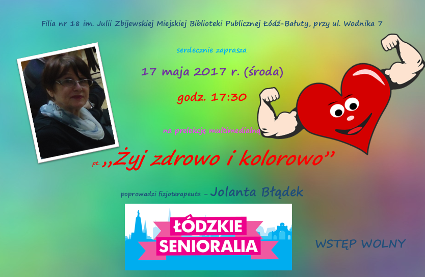Nasza biblioteka w tym roku również wzięła udział w obchodach IV ŁÓDZKICH SENIORALIÓW. 17 maja Pani Jola Błądek poprowadziła prelekcję pt. "Żyj zdrowo i kolorowo". W bardzo przystępny sposób opowiedziała o aktywności i kulturze żywności ludzi starszych w różnych krajach. Nie obyło się bez dobrych rad,jak zachować w tym wieku sprawność fizyczną i psychiczną. Uzupełnieniem prelekcji były ciekawe zdjęcia. Oczywiście temat jak zawsze był niewyczerpany, a słuchacze chętnie zadawali pytania.