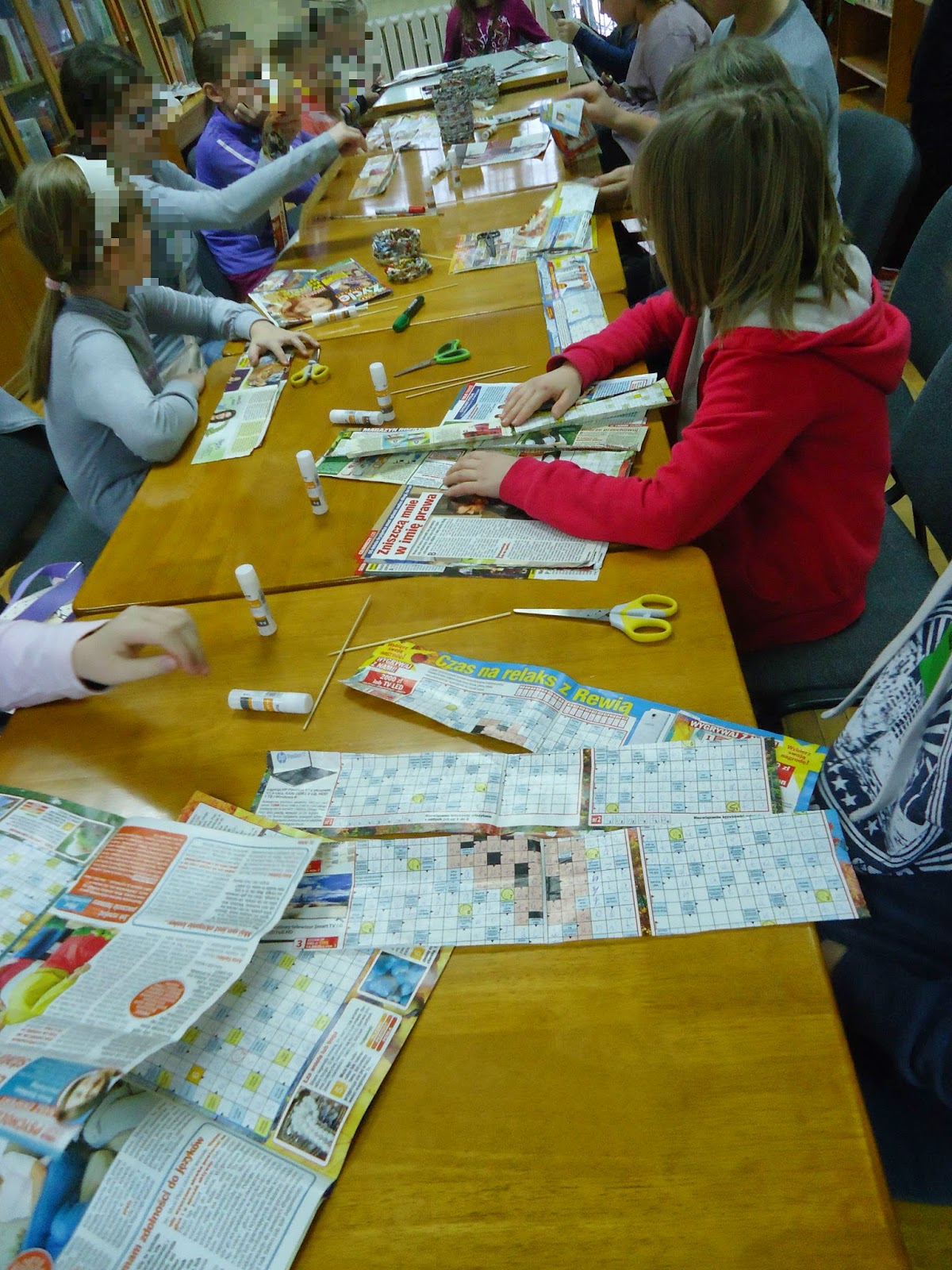 Jak co roku, nasi mali czytelnicy (i nie tylko) mieli możliwość uczestniczyć w zajęciach prowadzonych w Bibliotece. Tym razem uczyliśmy się wyplatać papierową wiklinę, z której powstały wspaniałe koszyczki np. na kredki. Warsztaty prowadziła jedna z bibliotekarek. Wyplatanie wydawało się trudne, ale tylko na początku. Okazało się, że wszyscy świetnie je opanowali, a koszyczki powstawały w błyskawicznym tempie.